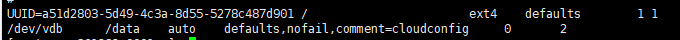 /dev/vdb /data auto defaults,nofail,comment=cloudconfig 0 2